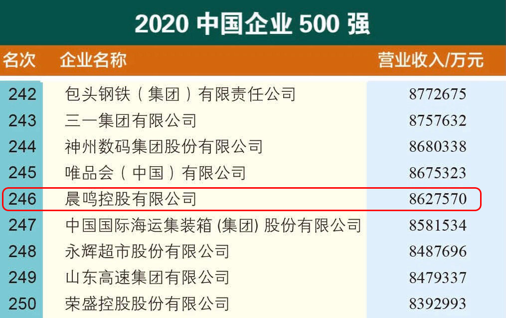 9月27-28日,由中國企業(yè)聯合會、中國企業(yè)家協(xié)會主辦的第19屆“2020中國500強企業(yè)高峰論壇”在河南鄭州召開,備受矚目的“2020中國企業(yè)500強”榜單正式發(fā)布,晨鳴控股排名第246位,位居行業(yè)榜首。在同期發(fā)布的“2020中國制造業(yè)企業(yè)500強”榜單中,晨鳴控股位列107位。