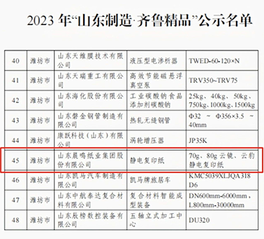近日,山東省工業(yè)和信息化廳公布2023年“山東制造·齊魯精品”公示名單,晨鳴集團(tuán)70g、80g云鏡、云豹靜電復(fù)印紙成功入選!